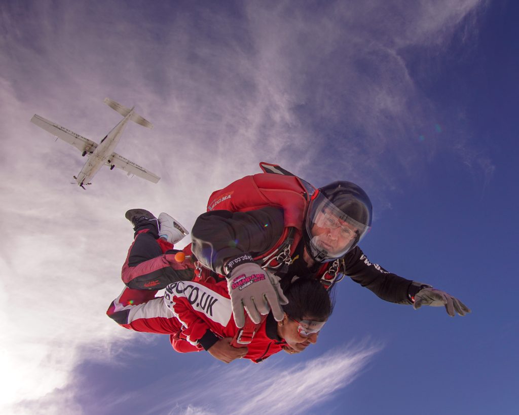 At this point, you might hear instructors casually mention it’s their first ever skydive… or that they’ll be sacked if they “lose another one,” or questioning if the harness is too loose.